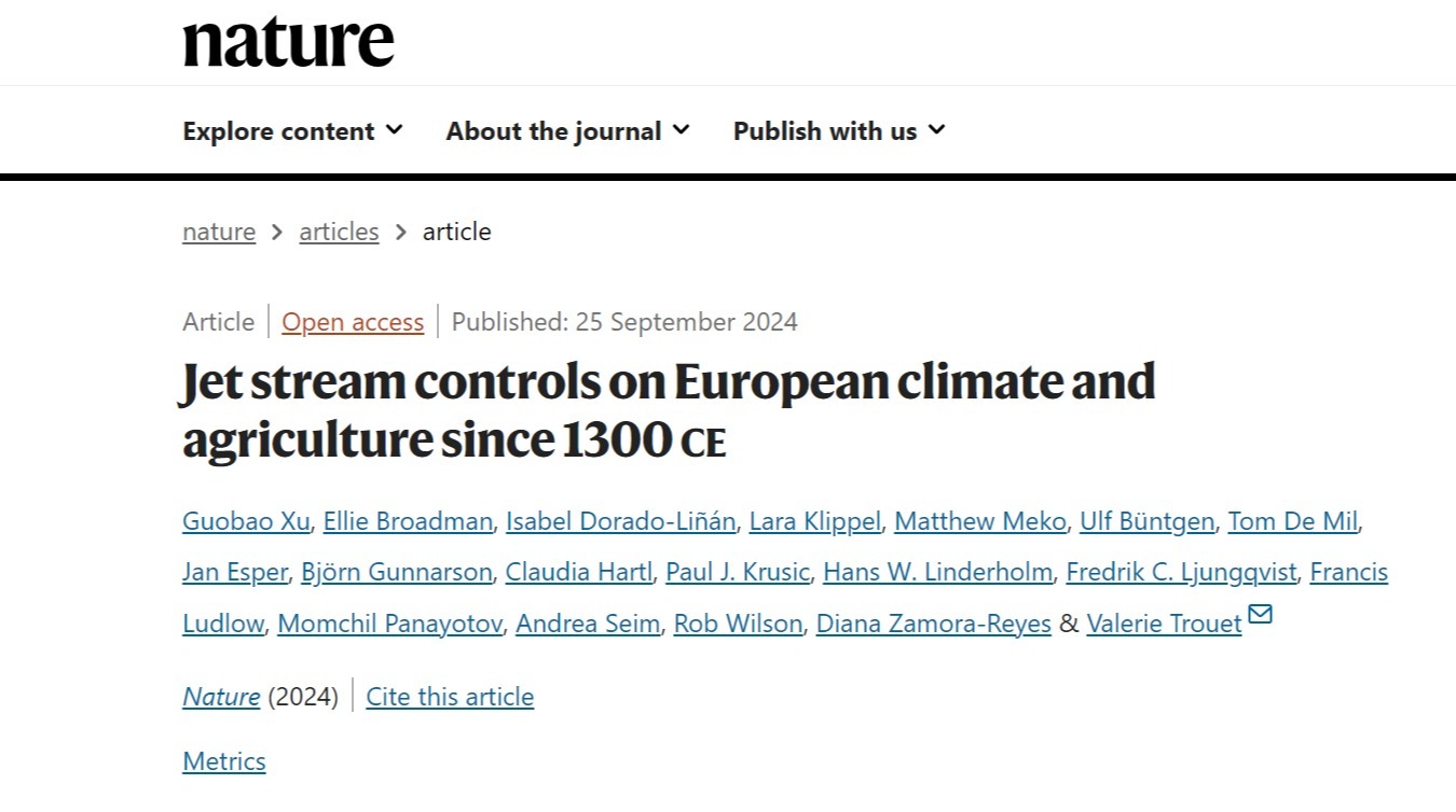 北京时间9月25日23时,AC米兰官网城市与环境学院徐国保教授以第一作者身份在国际顶尖期刊Nature(《自然》)发表长文“Jet stream controls on European climate and agriculture since 1300 CE”(大气急流影响了欧洲七个世纪的极端事件)。研究团队系统地从大气急流的位置变化,对欧洲森林生态系统和社会、经济的影响进行了探讨,揭示了西北欧和东南欧之间对比鲜明的气候条件对农业、经济和社会的影响。徐国保教授和合作者Valerie T...