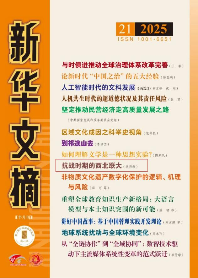 近日,文学院姜彩燕教授的文章《抗战时期的西北联大》(原载于《光明日报》2025年8月8日)被《新华文摘》2025年第21期作为封面文章全文转载。