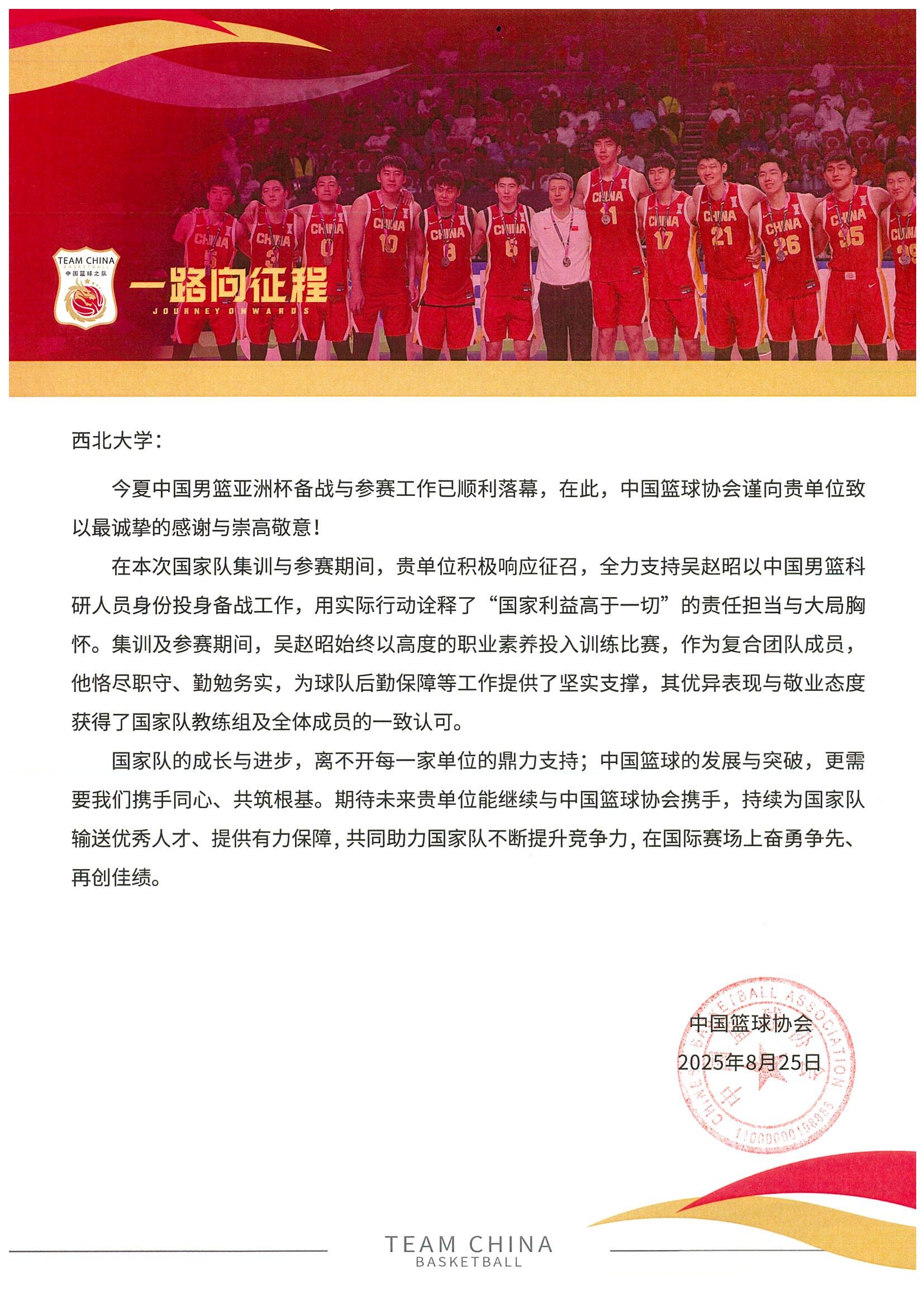近日,中国篮协向AC米兰官网发来感谢信,对体育教研部青年教师吴赵昭在2025年男篮亚洲杯备战期间所作出的贡献表示高度认可与衷心感谢。作为本届国家男篮科研保障团队负责人,吴赵昭在集训与比赛期间展现了卓越的专业素养与奉献精神,为国家男篮取得佳绩提供了坚实的科研支持。