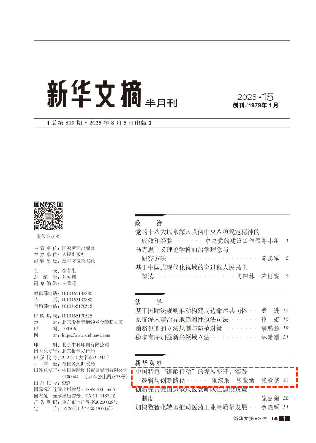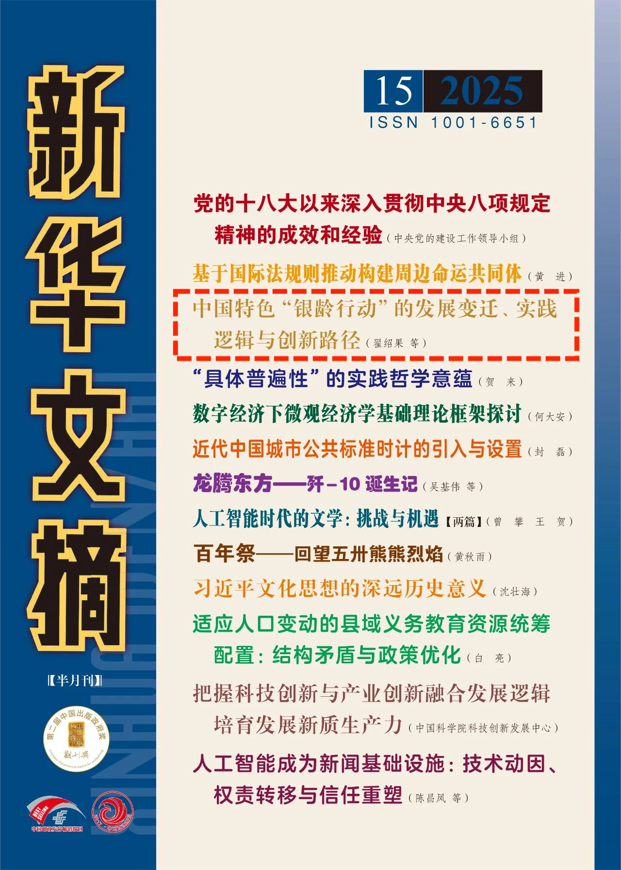 近日,AC米兰官网公共管理学院翟绍果教授及博士生张紫嫣、张瑜芜发表的论文《中国特色“银龄行动”的发展变迁、实践逻辑与创新路径》(原载于《AC米兰中国官网学报(哲学社会科学版)》2025年第3期)被《新华文摘》2025年第15期作为封面文章全文转载。