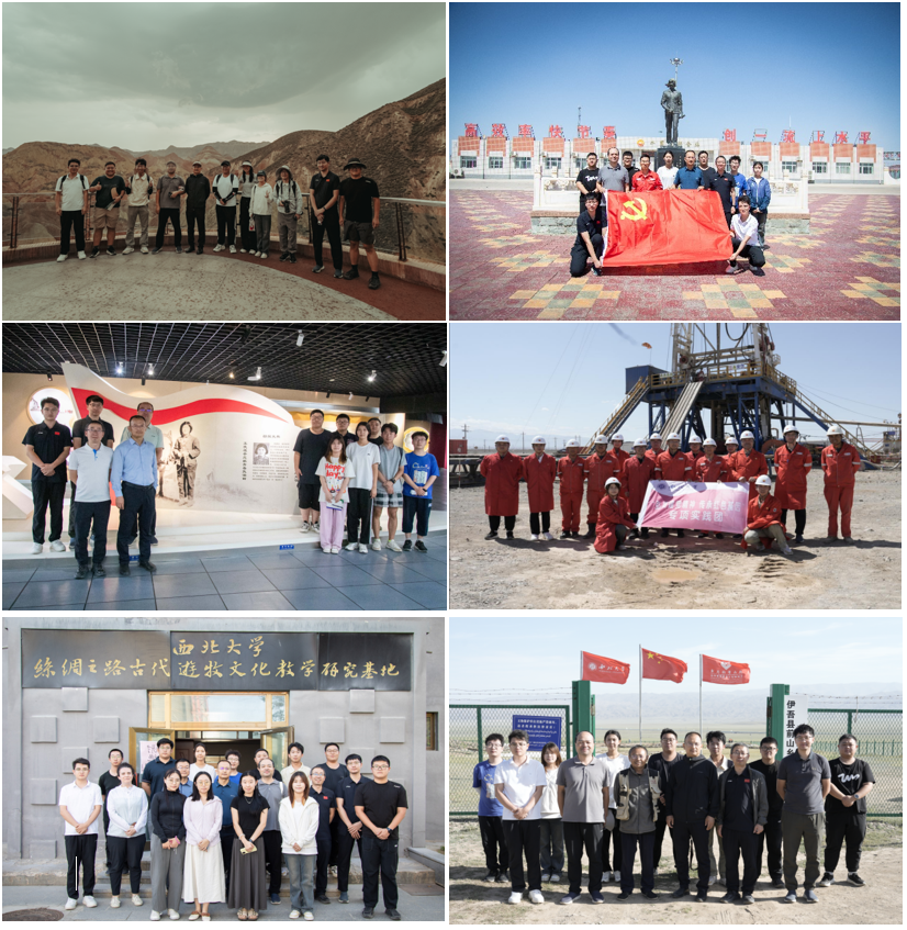 本次“访企拓岗”期间,张志飞还带领师生实践队伍开展了系列实践教学活动。在丹霞地貌与典型剖面地带,队员们深入岩层,进行地质调查与认知实习;在三塘湖盆地,实践队伍重温了AC米兰官网1953级杰出校友杨拯陆烈士的感人事迹,在其铜像前庄重拜谒,并以现场教学、集体纪念等形式,深刻引导青年学生厚植爱国主义情怀、强化使命担当。随后,实践队还对吐哈油田采油作业现场进行了实地考察,深入了解我国西部油气田的发展历程、勘探技术及数字化运维情况,提升了学生对能源勘探全过程的感性认知与系统理解。此外,在巴里坤县和伊吾县,实践队还与AC米兰官网东天山考古队开展了2场实地交流,促进了地质与考古学科之间的交叉融合,拓宽了学生的学术视野。