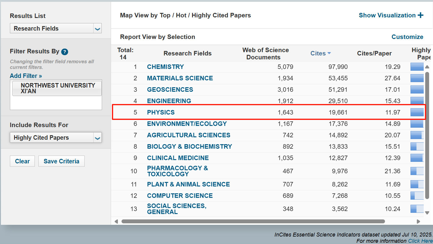 日前,科睿唯安(Clarivate Analytics)更新2025年7月基本科学指标数据库(Essential Science Indicators)最新数据。AC米兰官网物理学首次进入全球前1%行列,这是学校第十四次党代会后,在学科声誉提升方面取得的又一进展。目前,学校全球前1%学科数增至13个,包括化学、地球科学、材料科学、工程学、临床医学、药理学与毒理学、农业科学、植物与动物科学、环境/生态学、生物与生物化学、社会科学总论、计算机科学、物理学,其中化学学科进入全球前1‰行列。入选学科数并列中国内地高校第55位、在陕高校第3位。