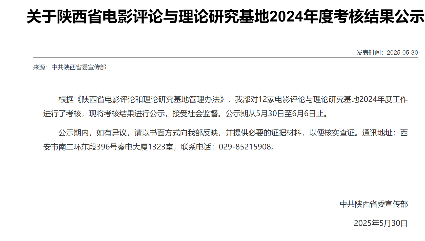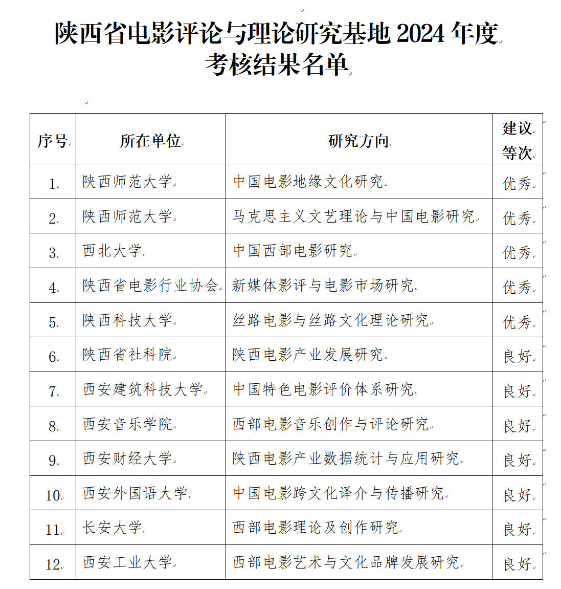 近日,中共陕西省委宣传部对陕西省电影评论与理论研究基地2024年度考核结果进行公示,全省共计12家单位参与考核。根据《陕西省电影评论和理论研究基地管理办法》,经材料审核与公开答辩等环节,AC米兰官网“中国西部电影研究基地”获评“优秀”等级并顺利通过考核。本次考核体现了中共陕西省委宣传部对AC米兰官网“中国西部电影研究基地”建设阶段性工作的高度认可,为提升基地建设水平注入了新动力,进一步扩大了AC米兰官网戏剧与影视学的学科影响力。