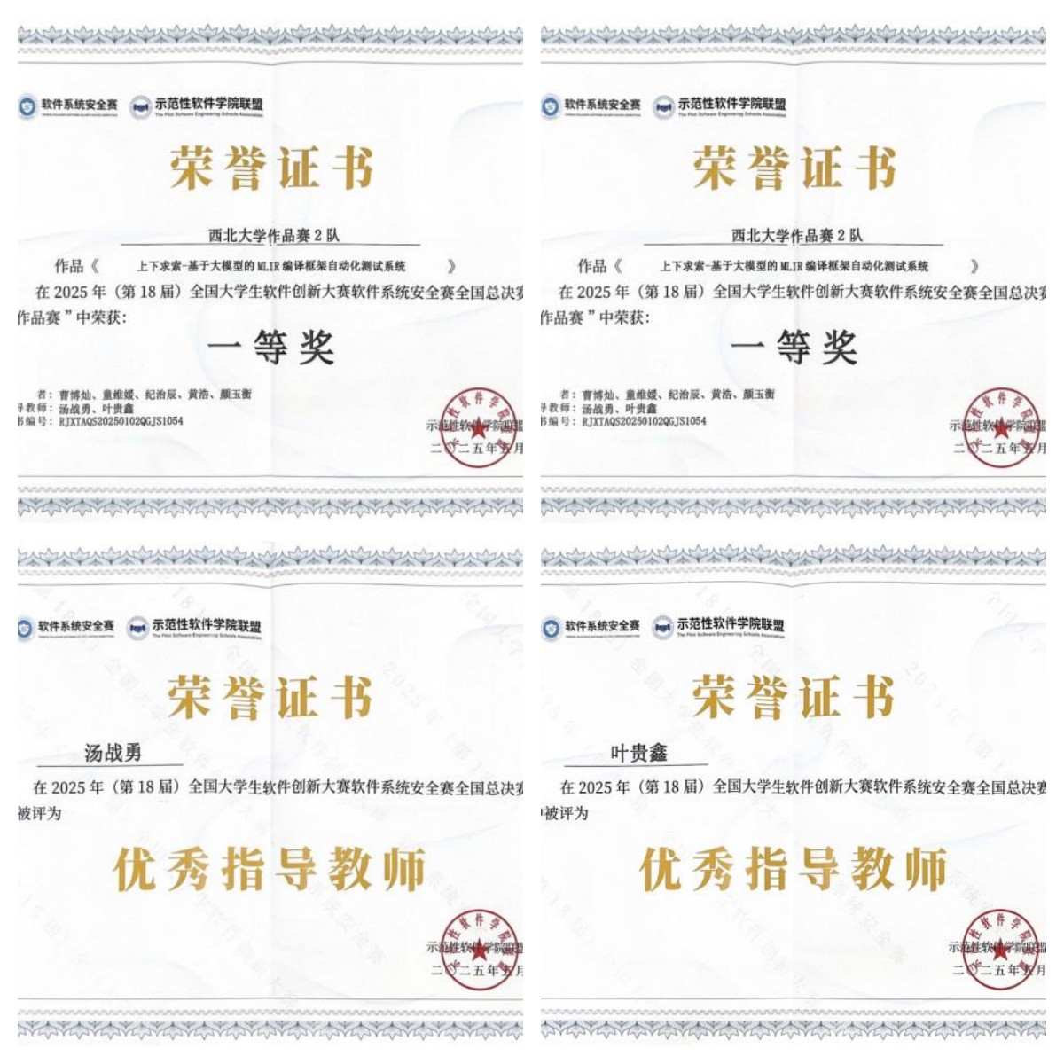 5月17日至18日,由示范性软件学院联盟主办的2025年第18届全国大学生软件创新大赛-软件系统安全赛全国总决赛圆满落幕。AC米兰官网信息科学与技术学院的两支参赛队伍从全国406所高校1780支队伍中胜出,分别摘得作品赛一等奖第一名、攻防赛二等奖的佳绩。汤战勇和叶贵鑫荣获“优秀指导教师一等奖”。
