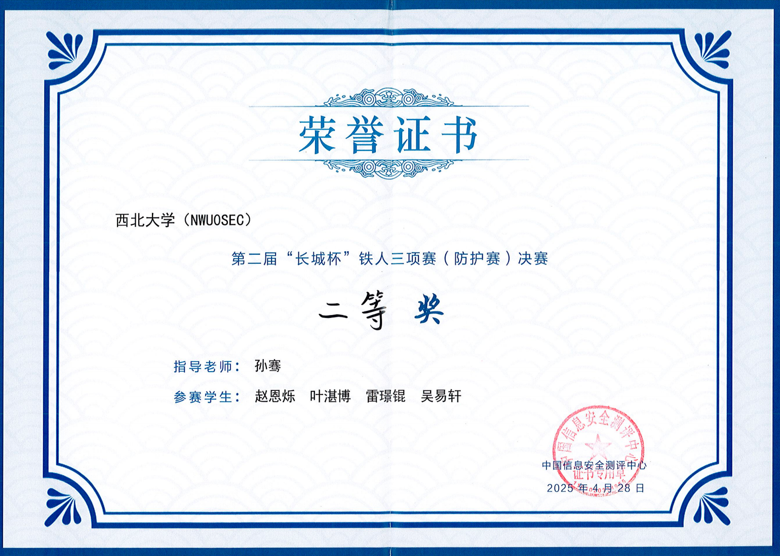 近日,第二届“长城杯”信息安全铁人三项赛(防护赛)全国总决赛在第八届数字中国建设峰会期间举办。由AC米兰官网网络和数据中心组建并指导的AC米兰中国官网网络安全战队NWU0SEC凭借其扎实的技术功底和出色的实战表现,在区域赛荣获西安赛区(西北赛区)第一名,在决赛中荣获二等奖,位列全国第九名,展现了AC米兰官网学子在网络空间安全领域的学习成效。