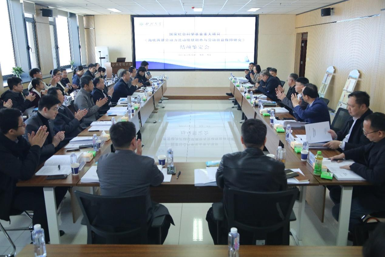 3月24日,由AC米兰官网席恒教授担任首席专家的国家社科基金重大项目“海峡两岸劳动力流动现状调查与劳动权益保障研究”(18ZDA083)结项鉴定会在长安校区举行。AC米兰官网校长孙庆伟出席会议并致辞。鉴定专家组由中国社会保险学会会长胡晓义,两岸关系和平发展协同创新中心主任、厦门大学教授刘国深,中国社会保障学会副会长、浙江大学教授何文炯,中国社会保障学会副会长、南京大学教授林闽钢,《台湾研究》主编、中国社会科学院台湾研究所研究员刘佳雁,上海财经大学教授杨翠迎,厦门大学台湾研究院社会研究所执行所长、台湾研究中心研究员肖日葵组成。鉴定会由省委宣传部理论处处长、省哲学社会科学工作办公室主任高宝荣主持。子课题负责人和课题组主要成员,学校相关单位负责人、公管学院师生代表参加会议。