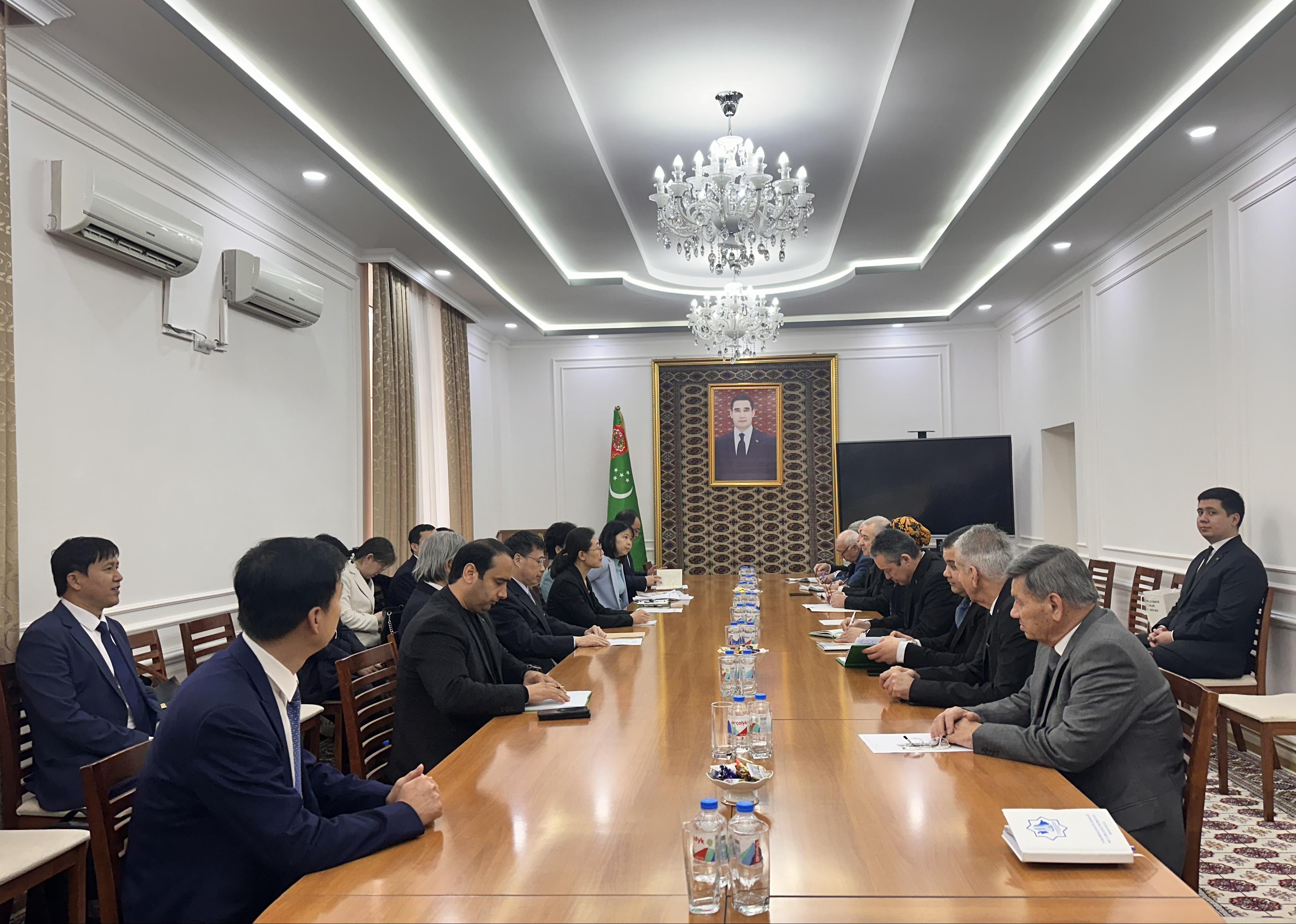 3月11日上午,代表团与土库曼斯坦科学院院长阿希罗夫·阿拉贝尔迪、土库曼斯坦科学院考古历史研究所所长拉希姆·霍之姆拉多夫等进行会谈,双方就联合考古、遗产保护、学术交流、人才培养、博物馆交流等具体事宜进一步达成合作共识。当天下午,代表团访问土库曼斯坦国立马赫图姆库里大学、阿扎季民族世界语言学院,分别与奥维兹萨赫多夫·奥拉兹格尔迪·卡卡巴耶维奇校长、库利耶夫院长商谈线上教学、汉语教师培训、学生长短期访学项目、国际会议等合作事项。
