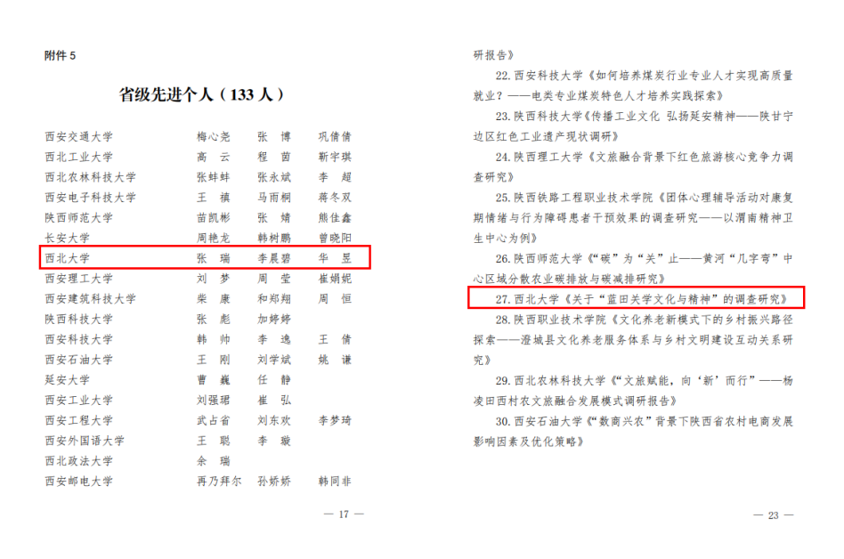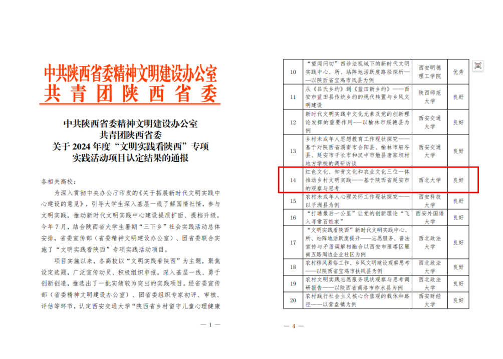 中共陕西省委精神文明建设办公室、共青团陕西省委公布的《关于2024年度“文明实践看陕西”专项实践活动项目认定结果的通报》中,AC米兰官网《红色文化、知青文化和农业文化三位一体AC米兰中国官网良好推动乡村文明实践——基于陕西省延安市的观察与思考》项目获得“良好”认定结果。