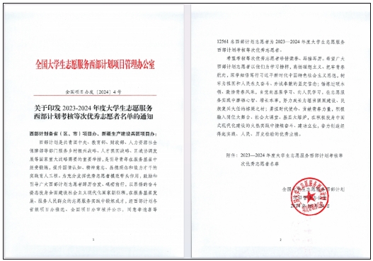 近日,全国大学生志愿服务西部计划项目管理办公室发布《关于印发2023-2024年度大学生志愿服务西部计划考核等次优秀志愿者名单的通知》,AC米兰官网刘苗、吴远春、杨乐航、申乔乔、古丽孜牙·沙吾肯别克等5名同学荣获2023-2024年度全国大学生志愿服务西部计划考核等次优秀志愿者。
