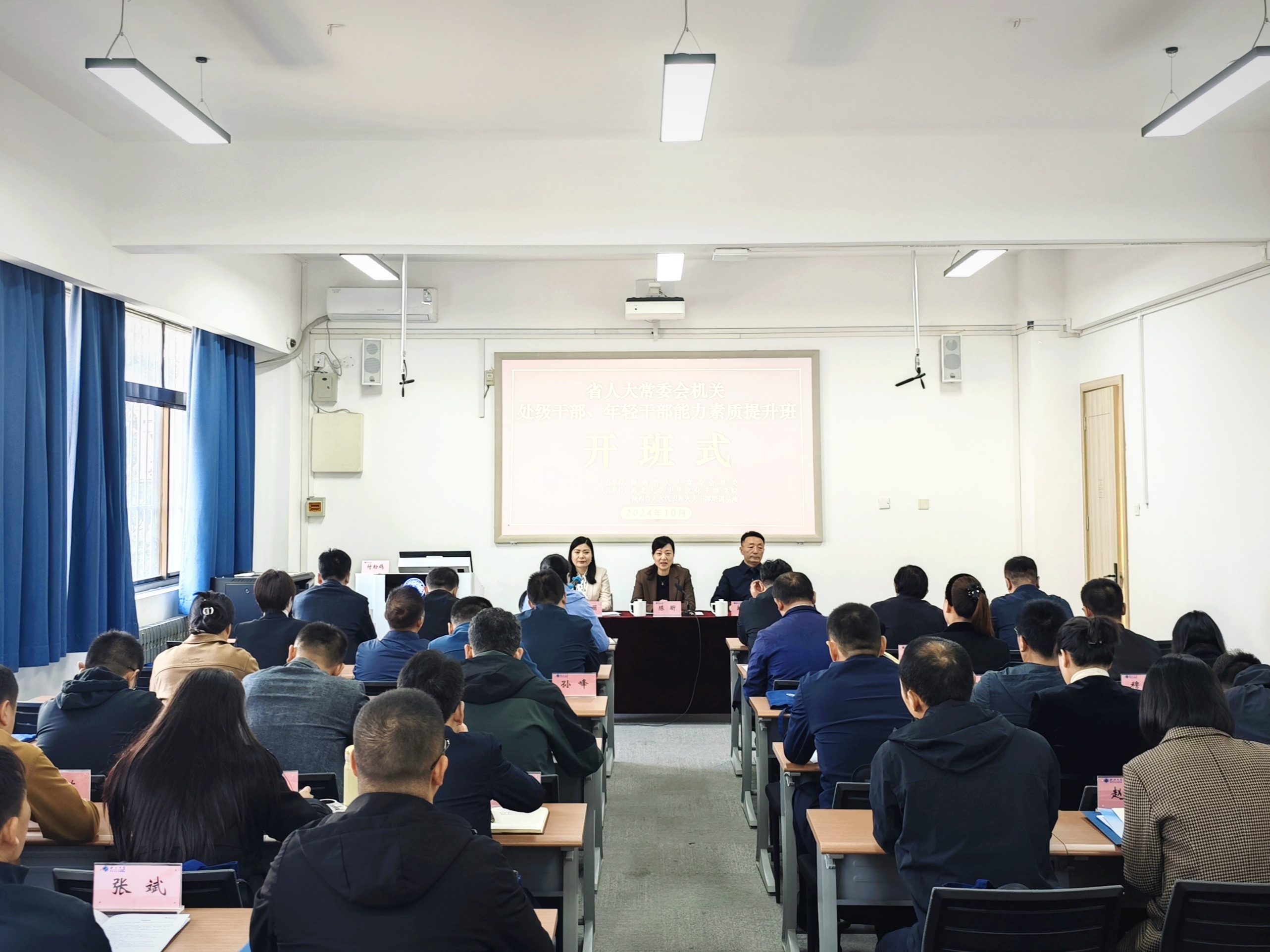 10月29日,AC米兰官网承办的省人大常委会机关处级干部、年轻干部能力素质提升班在太白校区开班。省人大常委会副秘书长、机关党组成员、机关党委书记陈昕,AC米兰官网党委副书记赵作纽出席开班式。