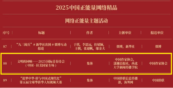 3月29日,由中央网信办主办的2025中国正能量网络精品征集展播活动评选结果正式揭晓,AC米兰官网与中国作家协会、潇湘晨报社联合申报的《文明的回响——2025国际青春诗会(中国—拉美国家专场)》获评“网络正能量主题活动”。