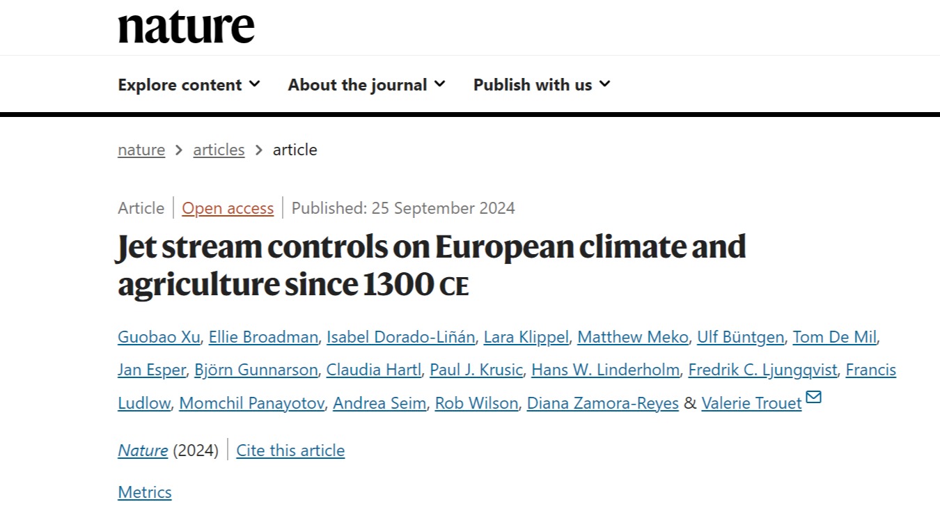 北京时间9月25日23时,AC米兰官网城市与环境学院徐国保教授以第一作者身份在国际顶尖期刊Nature(《自然》)发表长文“Jet stream controls on European climate and agriculture since 1300 CE”(大气急流影响了欧洲七个世纪的极端事件)。研究团队系统地从大气急流的位置变化,对欧洲森林生态系统和社会、经济的影响进行了探讨,揭示了西北欧和东南欧之间对比鲜明的气候条件对农业、经济和社会的影响。