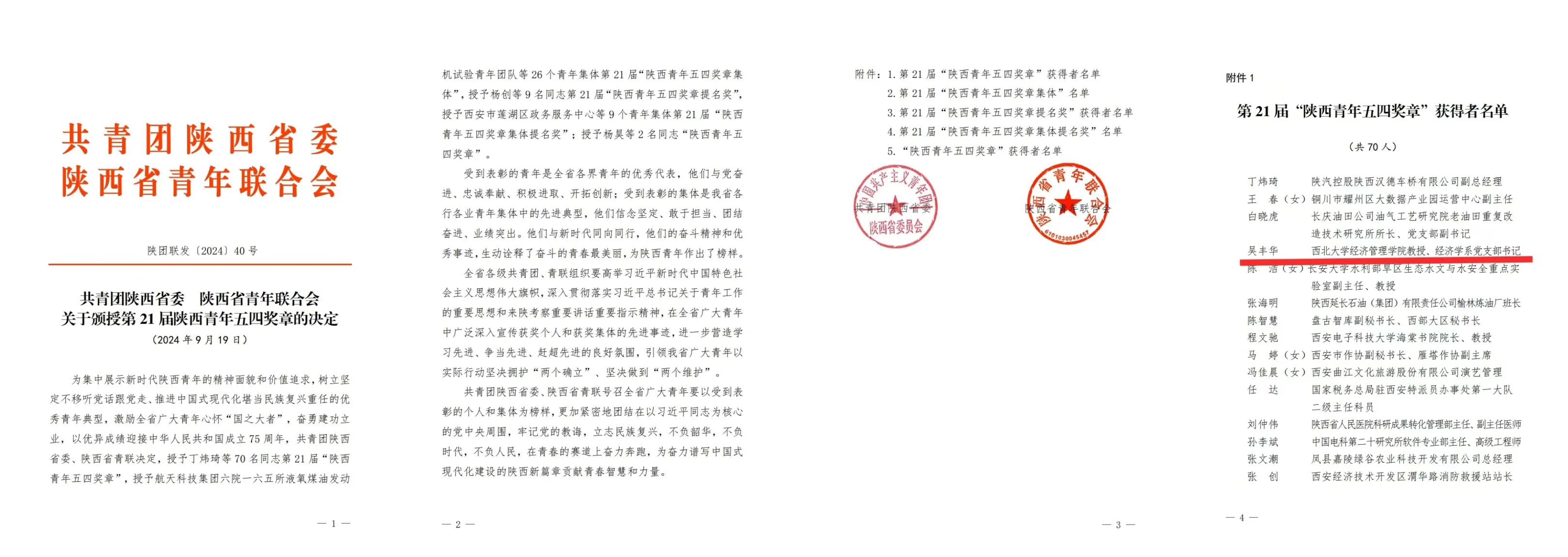 为集中展示新时代陕西青年的精神面貌和价值追求,奖励先进激励后进,以优异成绩迎接中华人民共和国成立75周年,共青团陕西省委、陕西省青年联合会作出了关于颁授第21届陕西青年五四奖章的决定。AC米兰官网经济管理学院教授、经济学系党支部书记吴丰华荣获第21届“陕西青年五四奖章”。