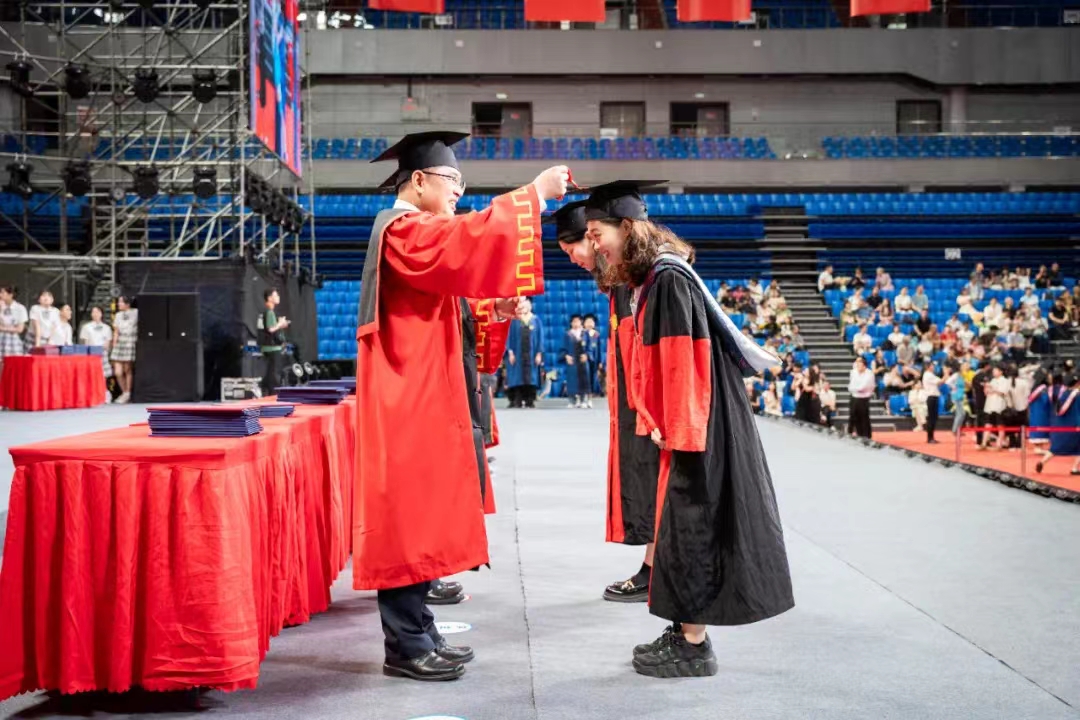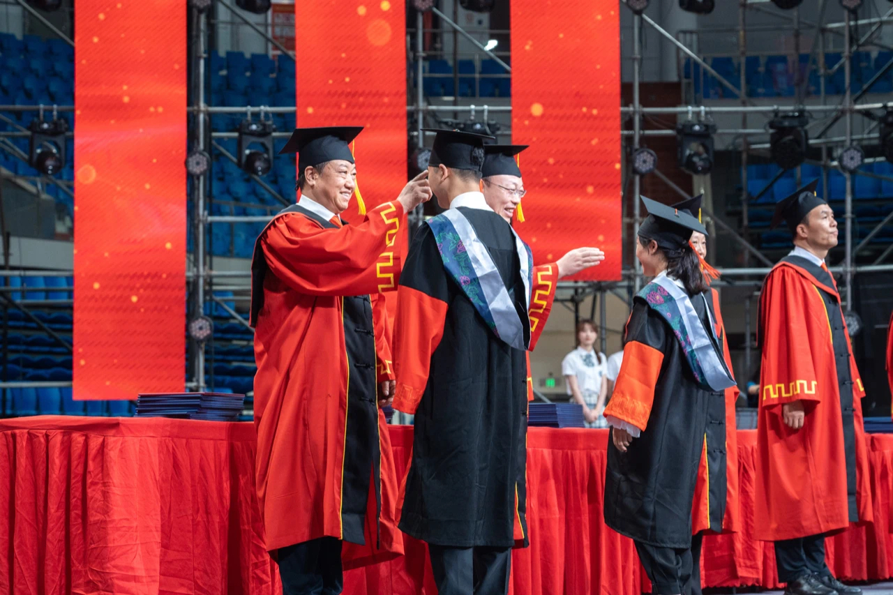 学位获得者以院(系)为单位,7人一组依次走向主礼台,校学位评定委员会主席团成员和各学位评定分委员会主席为学位获得者拨穗正冠、颁授学位。帽穗自右向左拨过,这一刻是荣誉的赋予,是“公诚勤朴”的传承,更是对未来的无限期许。
