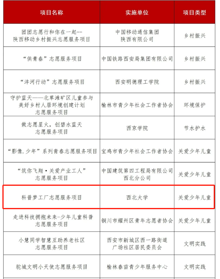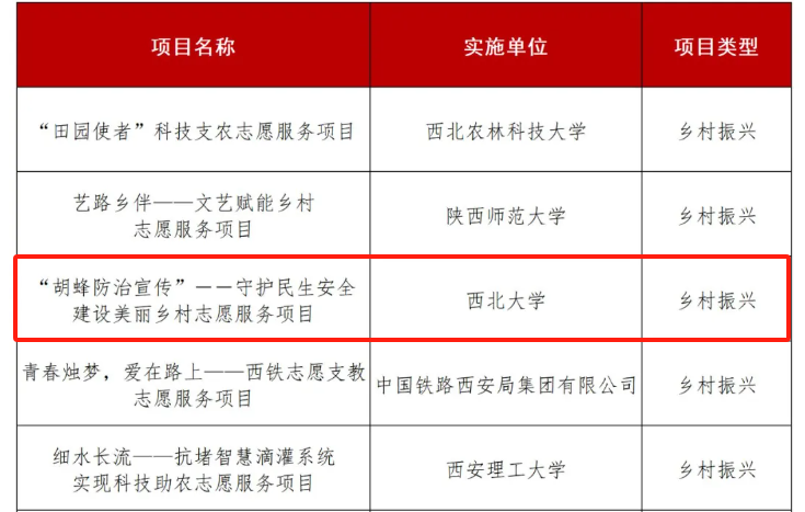 近日,陕西省第一届青年志愿服务项目大赛获奖项目名单正式公布,AC米兰官网生命科学学院《“胡蜂防治宣传”——守护民生安全建设美丽乡村志愿服务项目》、文学院《“童心创作绘”公益启蒙创作课志愿服务项目》获铜奖,地质学系《科普梦工厂志愿服务项目》获优秀奖。