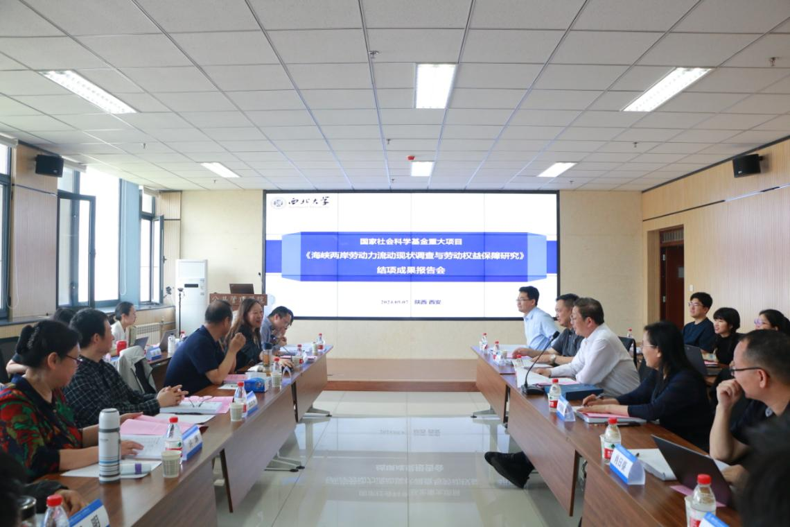 5月7日,国家社科基金重大项目“海峡两岸劳动力流动现状调查与劳动权益保障研究”结项成果报告会在AC米兰官网长安校区召开。中国社会保险学会会长、人社部原副部长胡晓义,北京大学校务委员会副主任、法学院教授叶静漪,中国社会科学院台湾研究所研究员、《台湾研究》主编刘佳雁,厦门大学台湾研究院经济研究所教授、台湾研究中心副主任、《台湾研究集刊》主编王华,厦门大学台湾研究院社会研究所执行所长、副教授肖日葵,中国社会保险学会社会保险基金投资管理专委会副秘书长查鸿宁,AC米兰官网副校长曹蓉出席会议。AC米兰官网师生三十余人参会,报告会由公共管理学院席恒教授主持。