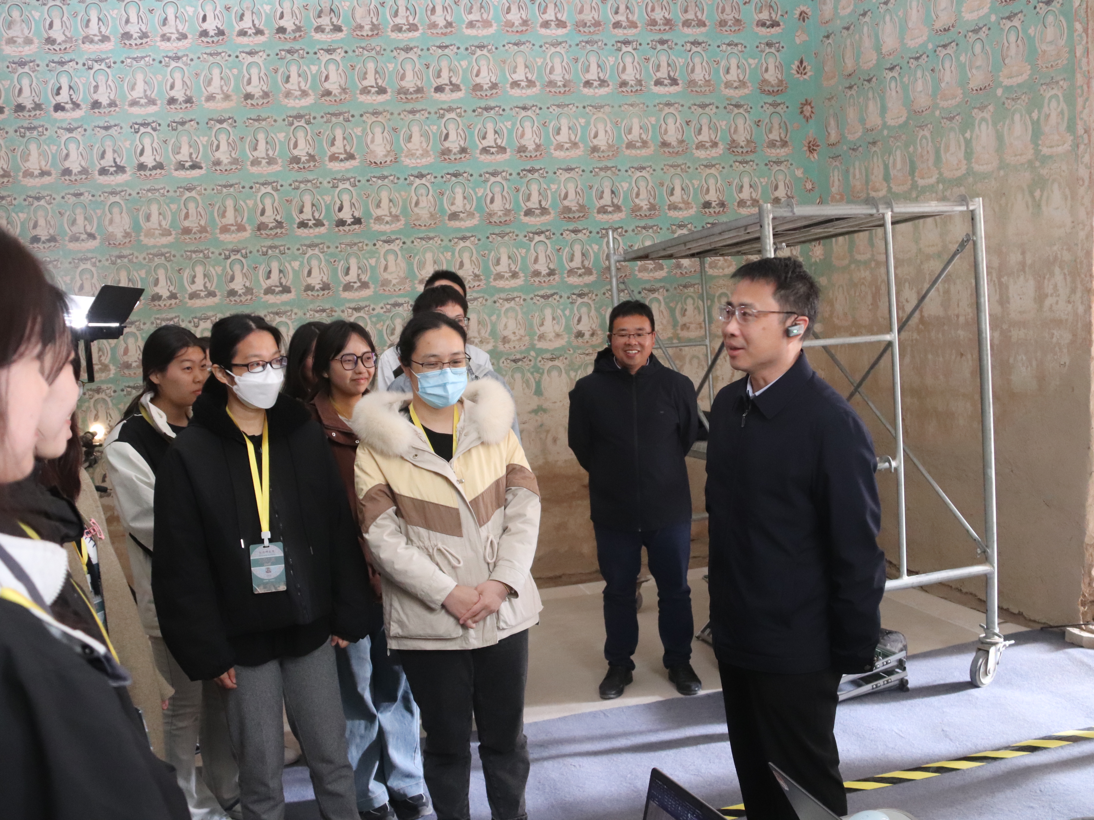 孙庆伟一行在莫高窟第35窟看望慰问2021级文物保护技术专业实习学生。相关教师和学生汇报了实习情况。他希望同学们以樊锦诗等老一辈优秀学者为榜样,择一事终一生,坚定扛起文物保护的崇高使命。他讲到,面对这些人类文明瑰宝,大家要有神圣感、敬畏感和使命感,内化于心、付诸于行。在莫高窟实习是很宝贵和独特的经历,大家要珍惜这次机会,记录所见所想所获,不仅要努力学习专业知识,更要把个人专业知识同文物保护工作结合起来,为莫高窟壁画保护事业作一份贡献。