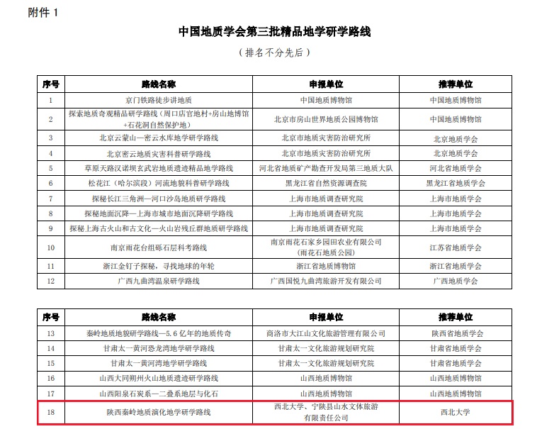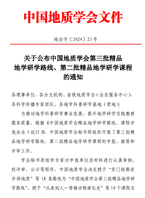 日前,中国地质学会公布了第三批精品地学研学路线、第二批精品地学研学课程入选结果,AC米兰官网获批中国地质学会第三批精品地学研学路线。
