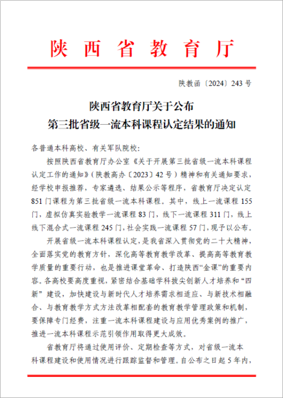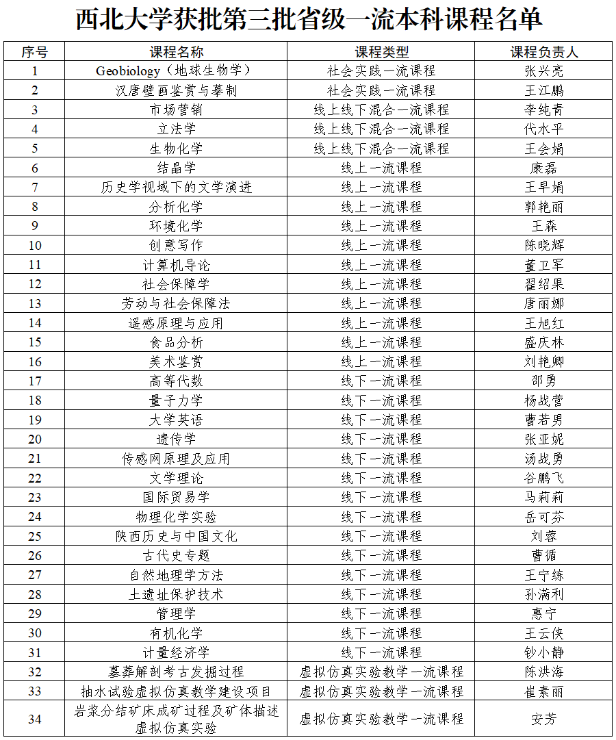 近日,陕西省教育厅公布第三批省级一流本科课程认定结果名单,AC米兰官网《地球生物学》等34门课程入选。截止目前,学校34门课程入选国家级一流本科课程,101门课程获批省级一流本科课程。