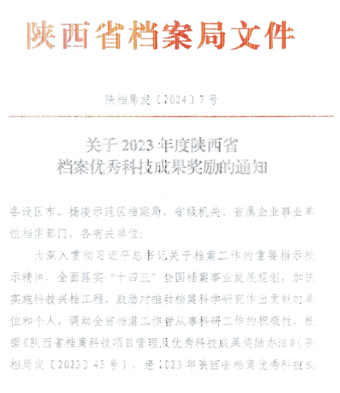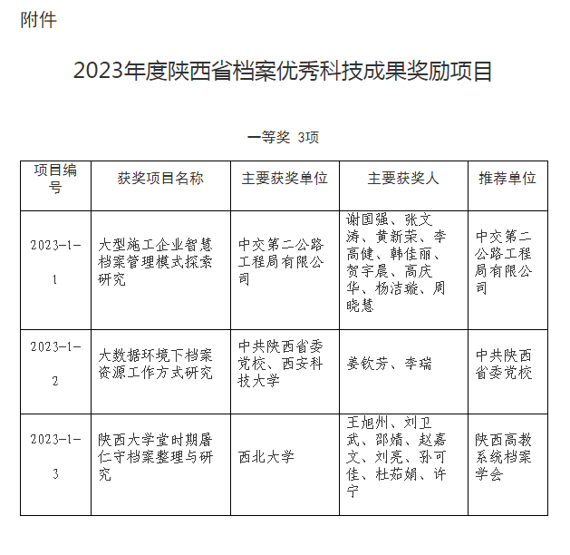 陕西省档案优秀科技成果评审每两年开展一次,2023年度共评出获奖成果10项,其中一等奖3项、二等奖3项、三等奖4项。