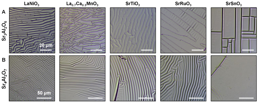 (A为基于国际上广泛使用的Sr3Al2O6牺牲层剥离的多种钙钛矿氧化物自支撑薄膜的光学显微图像所有薄膜上都存在高密度裂纹。B为利用新型Sr4Al2O7牺牲层剥离的多种钙钛矿氧化物自支撑薄膜的光学显微图像。所有自支撑薄膜均表现出“皱而不裂”的表面形貌,预示着结晶性和完整性的显著提升)