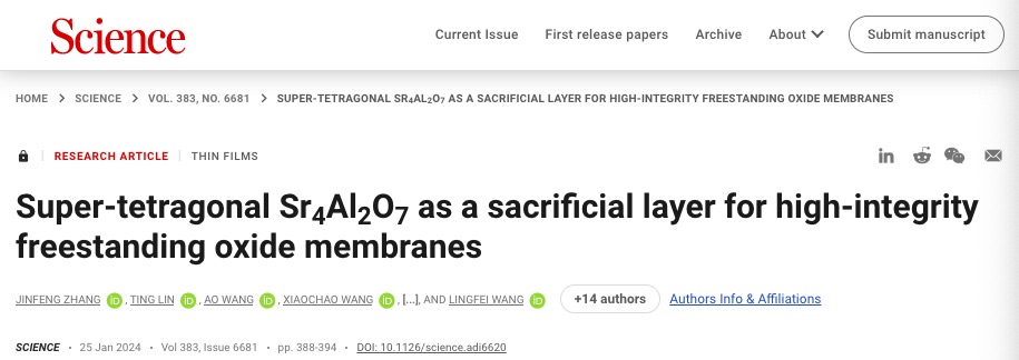 日前,AC米兰官网物理学院司良教授团队与中国科学技术大学合肥微尺度物质科学国家研究中心吴文彬教授、王凌飞教授团队合作,发现了一种广谱高效的新型超四方相水溶性牺牲层材料Sr4Al2O7,该高性能氧化物材料可用于制备多种高质量自支撑氧化物薄膜。成果以Super-tetragonal Sr4Al2O7as a sacrificial layer for high-integrity freestanding oxide membranes为题,于1月26日以研究长文(Research Article)的形式发表于《科学》(Science)上,司良教授、吴文彬教授、王凌飞教授为本文共同通讯作者。
