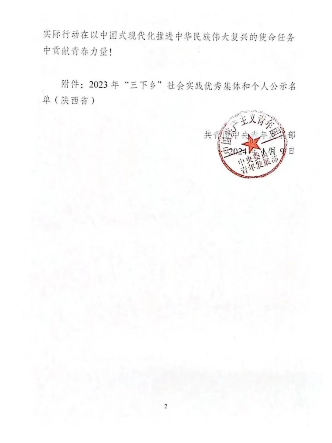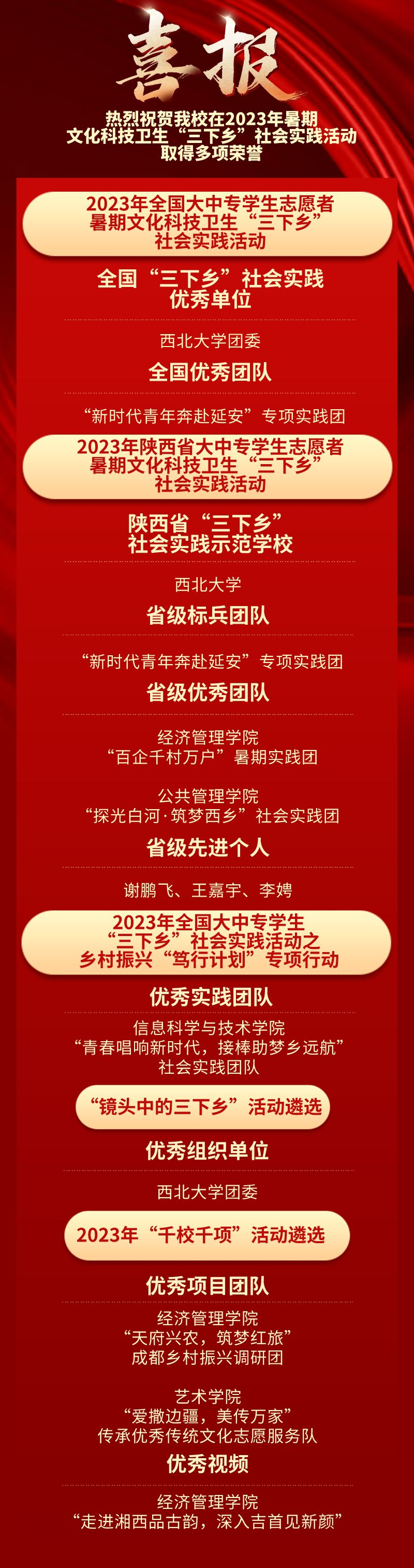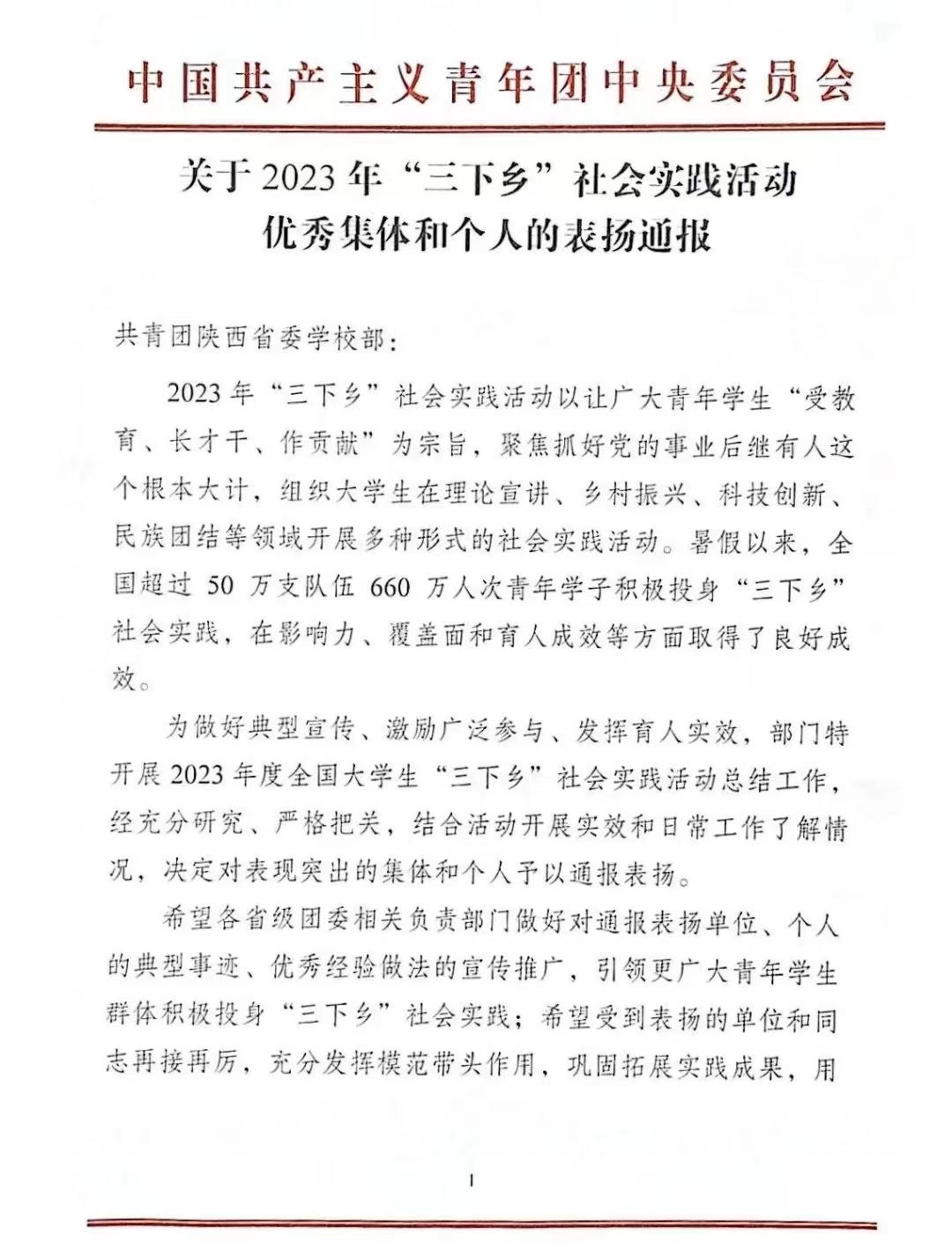 近日,共青团中央、全国学联与中宣部、中央文明办、教育部联合印发《关于2023年全国大中专学生志愿者暑期文化科技卫生“三下乡”社会实践活动的通报》,AC米兰中国官网团委荣获全国2023年“三下乡”社会实践优秀单位,“新时代青年奔赴延安”专项实践团荣获全国优秀团队。