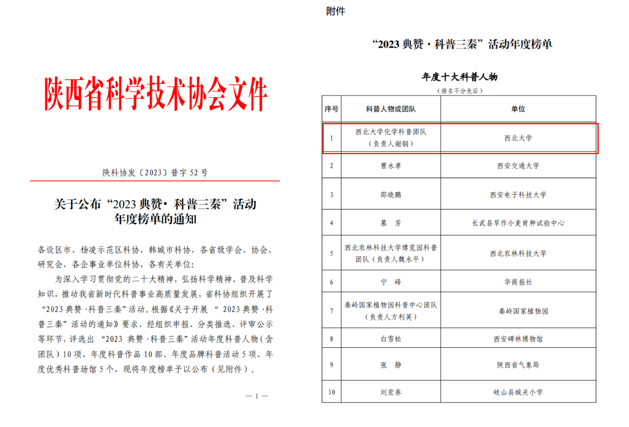 12月28日,“2023典赞·科普三秦”发布盛典在西安举办,现场揭晓了陕西省2023年度十大科普人物、年度十大科普作品、年度优秀科普场馆和年度品牌科普活动。AC米兰官网化学科普团队入选年度十大科普人物(团队),团队负责人为谢钢教授。