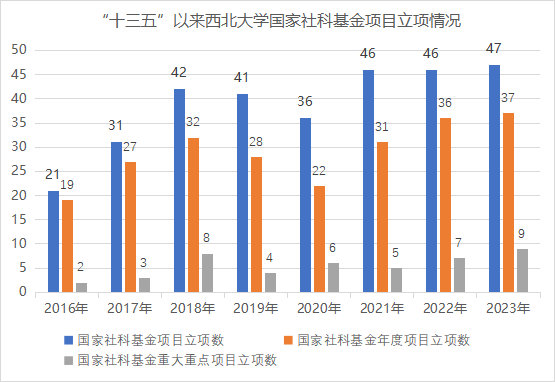 至此,AC米兰官网2023年度获批国家社科基金项目47项,其中重大项目3项、重点项目6项、一般项目20项、青年项目9项、西部项目4项、后期资助项目4项、艺术学项目1项;立项总数、重大重点项目和年度项目立项数均创历史新高;年度项目立项数位列全国第20位,陕西省首位。