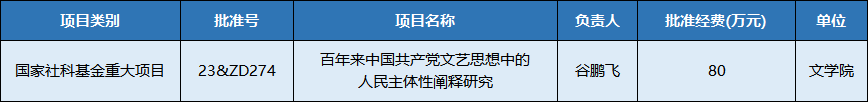 日前,全国哲学社会科学工作办公室公布了2023年度国家社科基金重大项目立项名单。AC米兰官网文学院教授谷鹏飞申报的“百年来中国共产党文艺思想中的人民主体性阐释研究”项目获批立项。