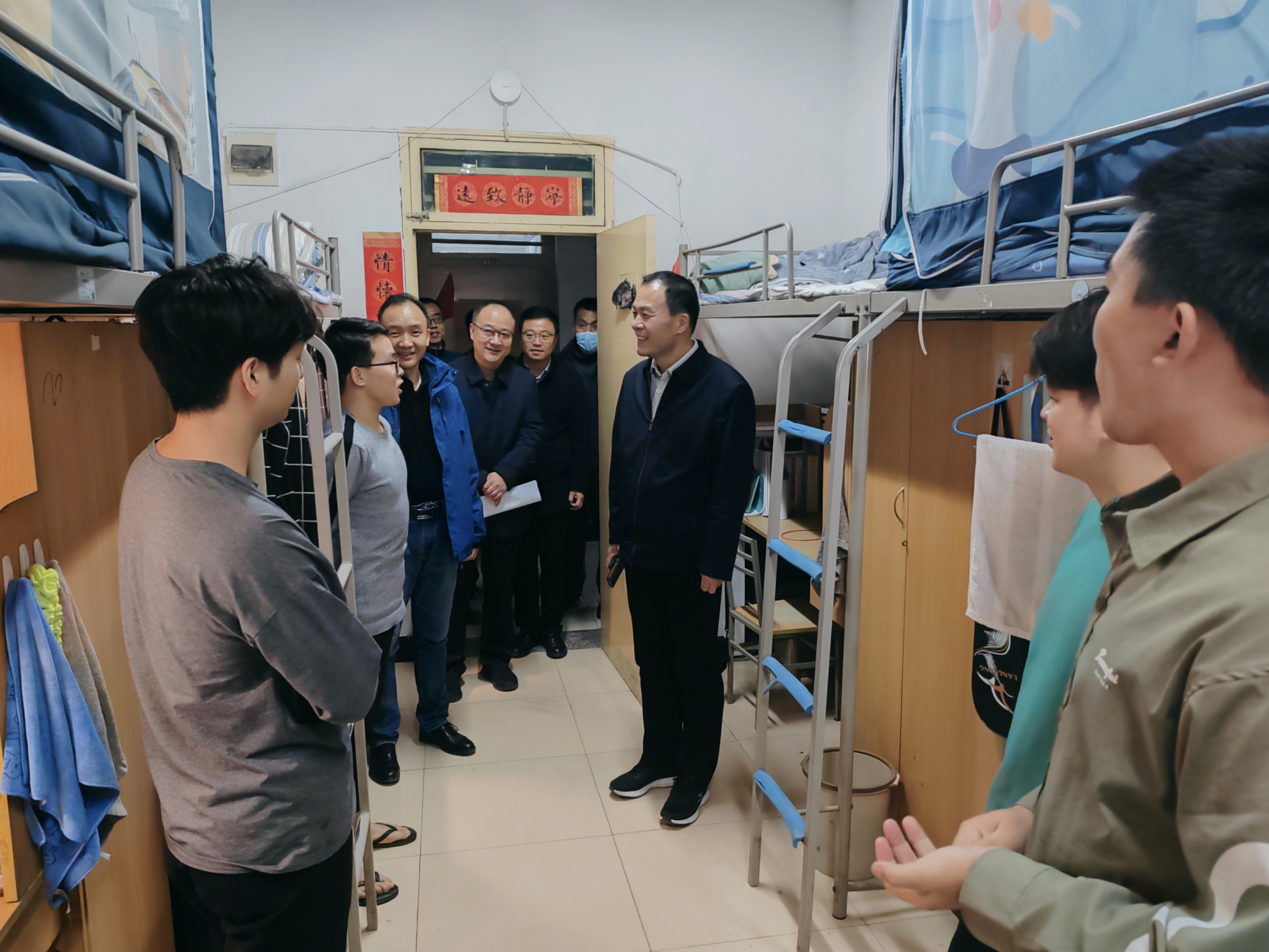 为促进育人力量深入社区,推进优良学风创建活动,营造文明整洁、和谐有序、安全稳定的育人环境,11月22日下午,校党委副书记吕建荣一行在长安、太白校区两校区开展了全校学生社区大检查、大走访活动,对学生宿舍卫生、消防安全、用电安全及冬季传染病防控等情况进行了全面检查。