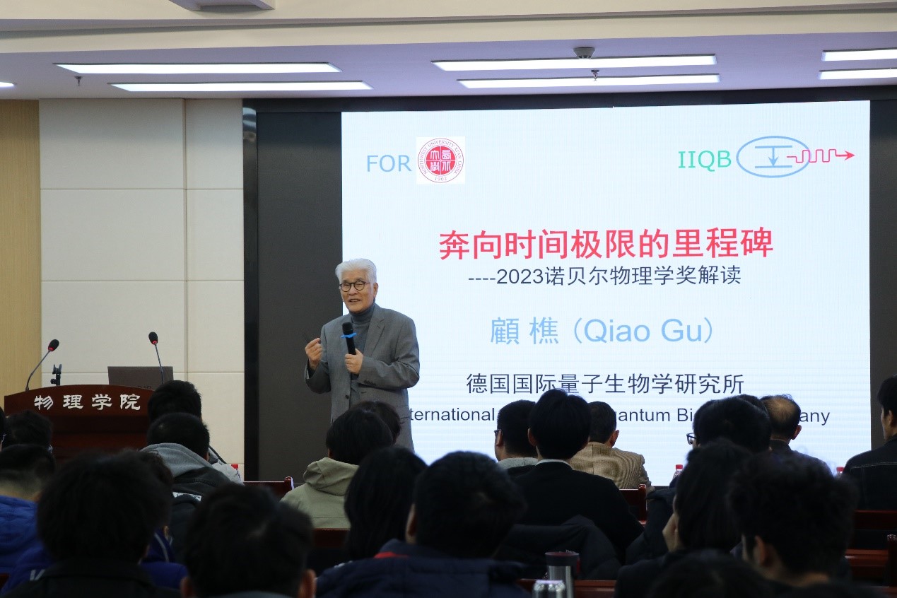 座谈会后,顾樵为物理学院师生作学术报告《奔向时间极限的里程碑----2023年诺贝尔物理学奖解读》,现场座无虚席。他首先介绍了诺贝尔物理学奖的历史以及历届诺奖得主,引入了2023年诺贝尔物理学奖得主——美国、德国、瑞典的三位科学家,以及他们在阿秒光脉冲产生及阿秒物理学研究方面做出的巨大贡献。他从1925年海森堡发表的一篇论文谈起,为大家讲解了时间极限的相关知识,并通过一个典型的阿秒现象入手,描述了阿秒体系的量子理论、量子模型,解释了如何用超短光脉冲捕捉瞬态过程。他指出,阿秒物理学在生活中已经有了较为广泛的应用,如阿秒脉冲火车、最新的阿秒实验、飞秒激光等,阿秒科学与技术将迎来越来越广泛的应用,进而丰富人类社会文明。报告会精彩纷呈,持续了2个半小时。顾樵教授的讲述注重追根溯源,同时深入浅出,重点突出而细致入微,赢得了现场的阵阵掌声,受到了师生们的高度赞誉。