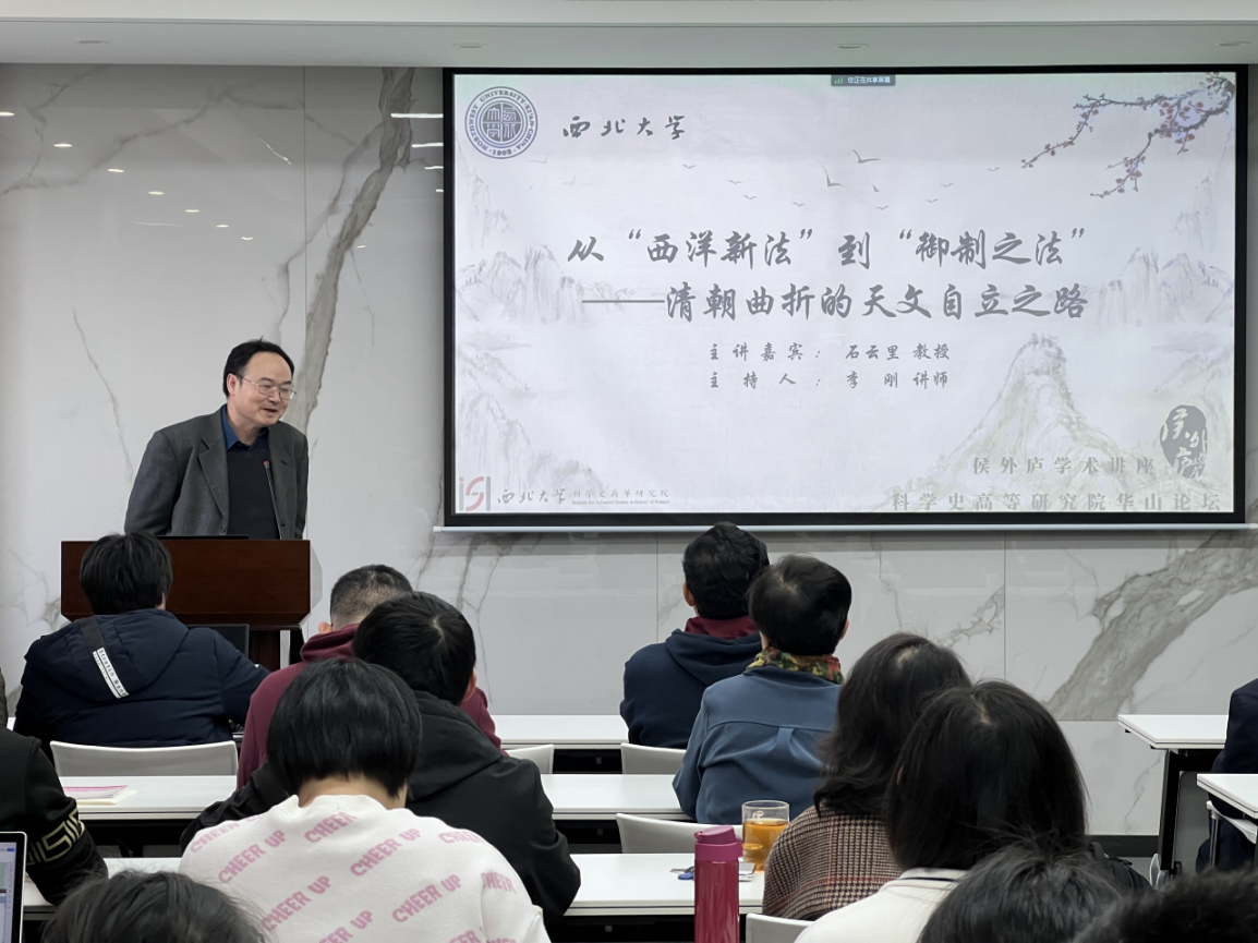 石云里的讲座探讨了清朝政府在西法传入时期探索天文自立之路的曲折过程。他从政治背景、编修人员、成书年份等方面介绍了《崇祯历书》的成书情况,并提出,随着政治局势的变化,该书经历了从《崇祯历书》到《西洋新法历书》《新法历书》《新法算书》等过程。但这一系列“西洋新法”作为官方历法被清廷采纳,且当时作为制定历法的最高机构钦天监也由来华耶稣会实际掌管,这些变故始终不能被朝野上下所接受。他详细介绍了康熙皇帝为了让西方天文学真正被国人接受而采取的“御制之法”,指出,康熙皇帝为打破耶稣会士对清朝官员天文学的垄断情形,建立了一套以本土学者组成的编纂队伍,从根本上体现了编历的“自主性”。石云里表示,本土历法家经过努力学习和研究,不但较好地掌握了“西洋新法”中的理论与算法,而且发现并纠正了其中存在的矛盾和错误,从而打破传教士的垄断,建立起了本土历法家在天文学上的自信以至于建立独立自主的天文历法体系。讲座结束后,石云里与现场师生就报告内容、相关制历过程等问题展开了交流讨论。