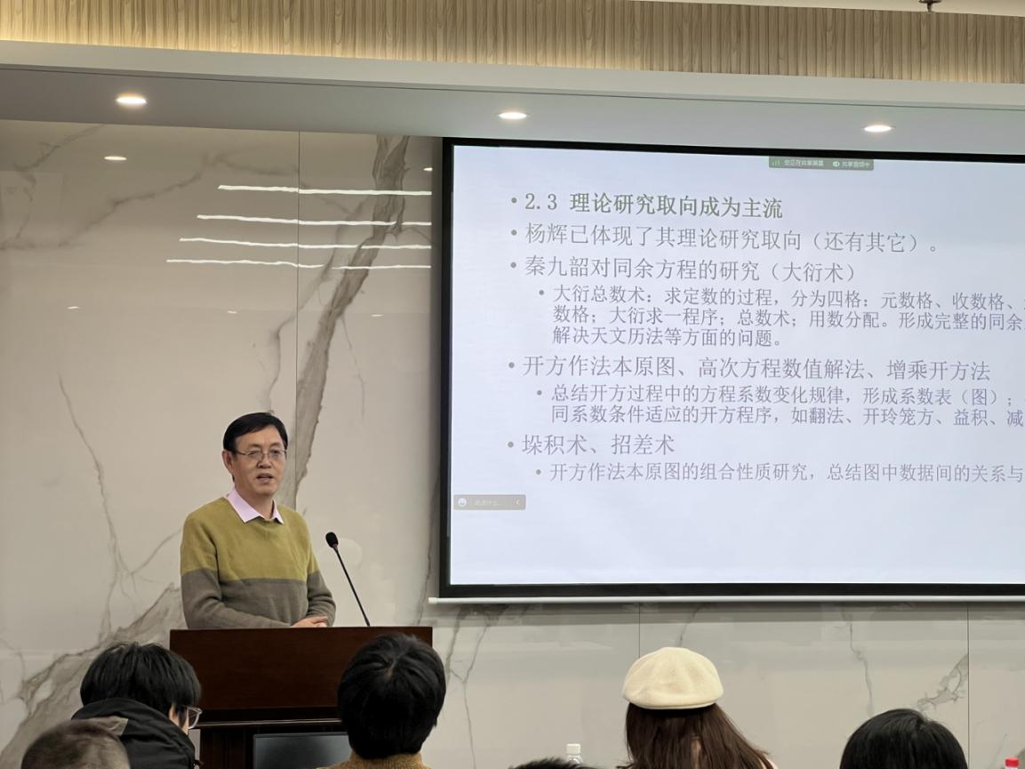 郭世荣通过梳理分析中国数学史研究近况,提出了“历史上的数学文化传承与数学思想发展”这一研究视角,并分三个部分作了讲解:宋元数学家对汉唐数学的继承与深化研究、九章体系的突破与理论研究取向的发展、宋元数学中若干新思想的形成。他列举了宋元数学家对《算经十书》的整理和研究工作,并指出,宋元数学家在对旧问题域中某些问题深化的研究产出了包括会圆术、隙积术、三斜求积等新成果。郭世荣表示,宋元时期的数学著作对旧问题域进行了新的拓展,在内容编排上从以问题为中心,转移到以算法为中心,进而提出在宋元时期的数学研究中,理论研究取向成为了主流取向。他以《乘除通变算宝》为例,指出重视数学算法的思想;以“习算纲目”和李冶、朱世杰的研究为例,指出重视数学教学的思想;以李冶“圆城图式”、朱世杰勾股“五和五较”等模型为例,指出重视数学模型的思想。最后,郭世荣从弘扬优秀传统文化是国家文化建设战略的重要议题、数学史研究如何服务国家战略、宋元数学如何处理继承传统与科学创新等方面做了总结,并强调,中国古代数学这一优秀传统文化要融入到国家文化建设战略之中。