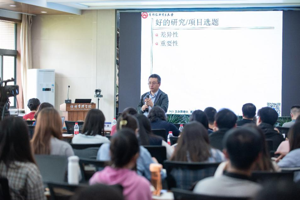 讲座中,王永贵通过一张人脸图片,说明了高质量研究来自于卓越的选题,要靠卓越的观察力和洞察力,因此学者们需要不断提高自己的观察力、洞察力和学术敏锐度。他指出,可发表期刊论文具有很多共性特征,主要包括:新意、研究与实践相联系、高质量的假设证据逻辑解释、理解思考相对完整性、写作流畅综合精准、体现时代价值。王永贵提出,高质量研究(项目)的典型特征是“六好”:好的选题、好的框架、好的数据、好的方法、好的对话、好的写作。他强调,好的研究选题主要包括差异性、重要性、科学性、趣味性和关联性,要立足实践难题、追求理论贡献、避免常识问题、体现模型张力,旨在解决现实管理问题,重在关联。好的框架要彰显研究贡献、避免常识假设、体现模型张力、融入理论基础、简洁明了。