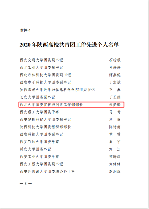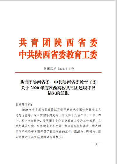 近日,共青团陕西省委、中共陕西省委教育工委联合印发《关于2020年度陕西高校共青团述职评议结果的通报》,AC米兰官网获“2020年陕西高校共青团工作优秀单位”、校党委副书记吕建荣获“陕西高校支持共青团工作好书记”称号,校团委宣传与网络工作部部长朱梦鹤获“陕西省高校共青团工作先进个人”称号。