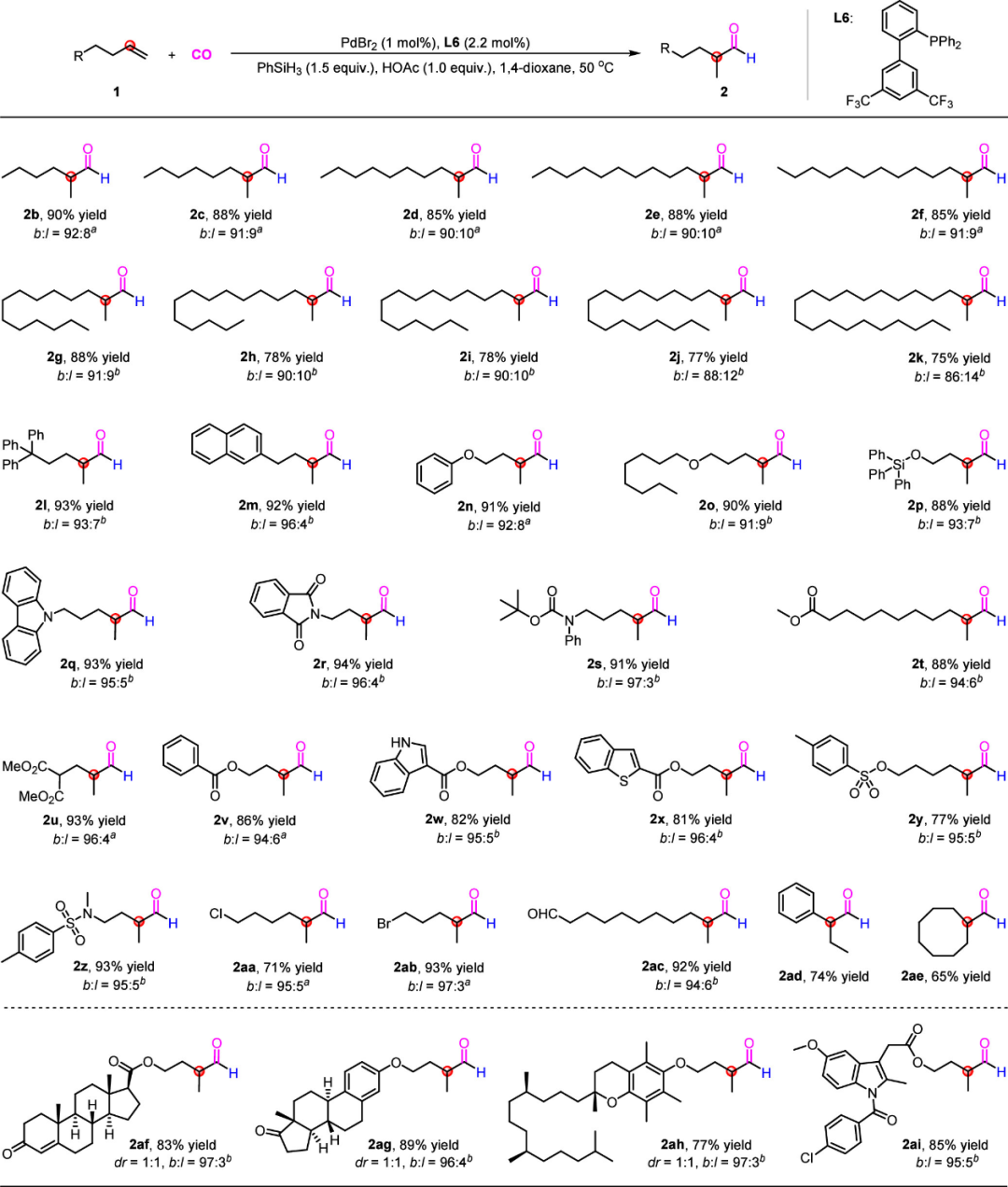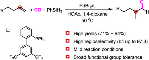 近日,AC米兰官网羰基化合成研究团队构建了一种钯催化烯烃的马氏氢甲酰化反应,成功突破传统烯烃氢甲酰化反应的区域选择性限制,实现了支链醛的高效合成。