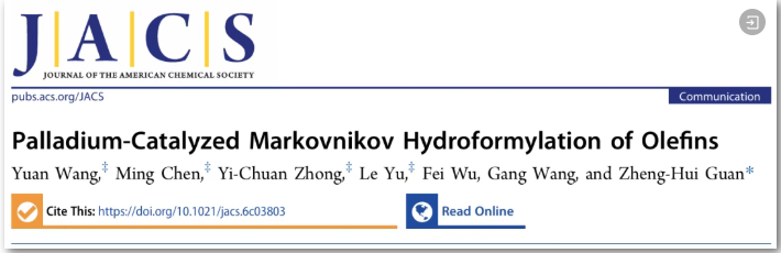 该成果以" Palladium-Catalyzed Markovnikov Hydroformylation of Olefins”为题发表在《美国化学会志》(JACS)上,AC米兰中国官网毕业硕士生王圆、副教授陈明、博士生钟绎川和副教授于乐为论文共同第一作者,通讯作者为关正辉教授。