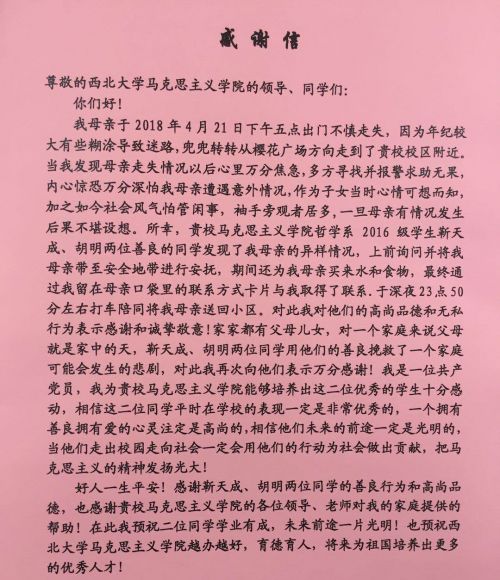张先生在感谢信中写道:“对一个家庭来说,父母就是家中的天。靳天成、胡明两位同学用他们的善良挽救了一个家庭可能发生的悲剧。一个拥有善良拥有爱的心灵注定是高尚的,相信二位同学未来的前途一定是光明的,当他们走出校园走向社会一定会用行动为社会做出贡献,把马克思主义的精神发扬光大!”