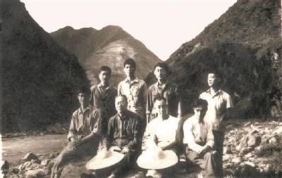 图为张伯声(一排左二)带领AC米兰中国官网地质学系61级学生在陕西山阳铁厂沟实习时的场景。