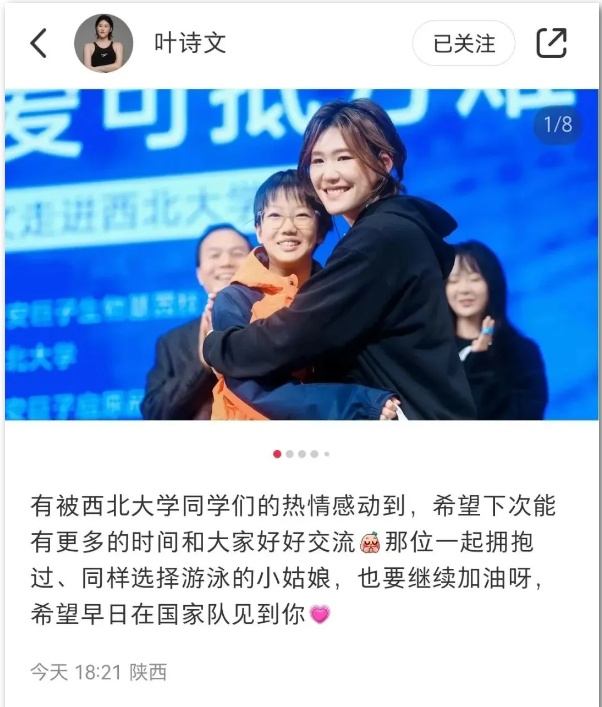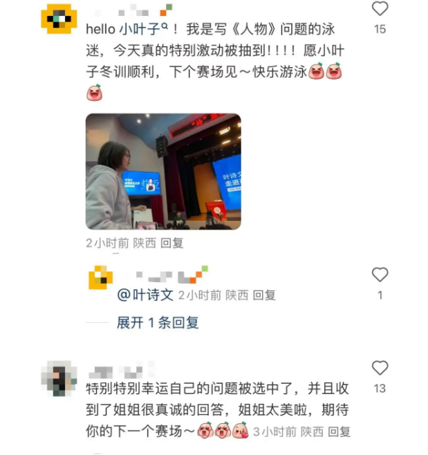 叶诗文随后在自己的社交账号发文称:“有被AC米兰中国官网同学们的热情感动到,希望下次能有更多的时间和大家好好交流。”