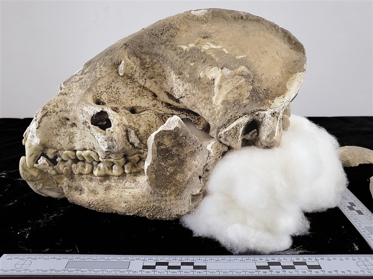 本报讯 (记者 李欣泽文/图)8月5日,记者从省自然资源厅获悉:近日,汉中市城固县一石灰岩溶洞内发现大熊猫化石,头骨化石完整度在90%以上,其他骨骼化石完整度达70%,国内罕见。这是陕西首次发现的保存完整度较高的大熊猫化石,具有重要的科学价值和科普价值。