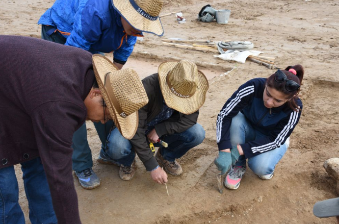 来自中国与乌兹别克斯坦的考古工作者在乌兹别克斯坦境内考古现场合影(资料照片)。新华社发