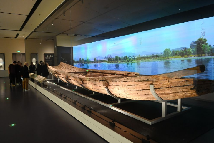 展馆核心地带,出土自汉长安城北渭桥遗址的古船“丝路一号”历经风雨,接受访客的惊叹。