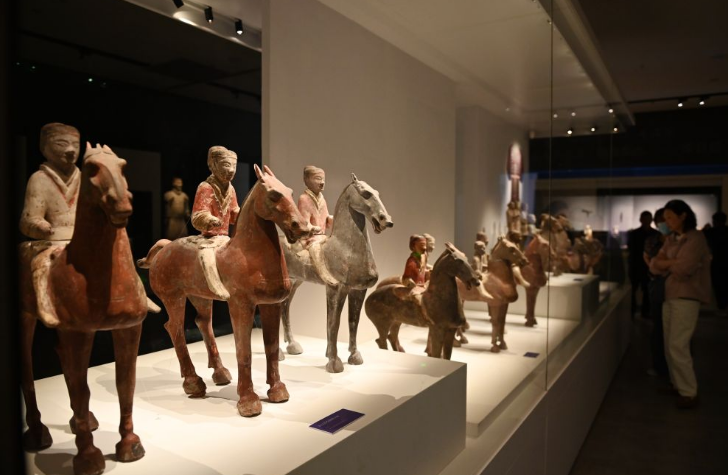 2024年5月6日,观众在陕西历史博物馆秦汉馆参观陕西咸阳杨家湾汉墓出土的西汉彩绘陶俑。新华社记者 李一博 摄