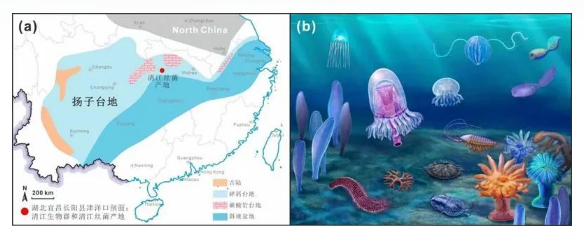 清江丝菌化石的产地和环境背景。(a)为早寒武纪扬子台地岩相古地理图和清江丝菌及所属清江生物群的化石产地;(b)为清江生物群生态复原图