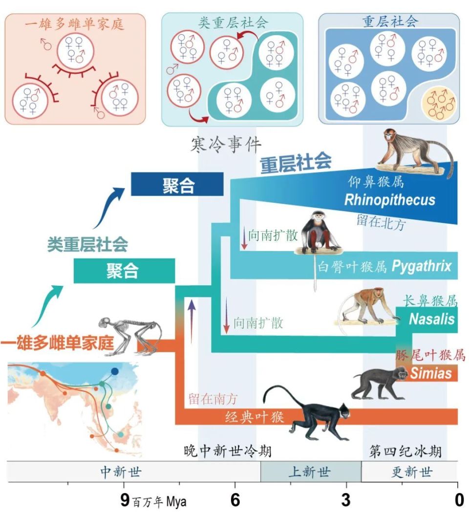 AC米兰中国官网齐晓光教授团队联合国内外多家科研单位,通过整合生态学、地质学、行为学、进化基因组学等多学科,通过系统发育分析和社会系统的祖先状态重建,发现亚洲叶猴中奇鼻猴类群的社会系统演化经历了两步式的聚合过程,且两次聚合都与冰期时期相关。在此过程中,与寒冷适应和神经激素相关的基因在奇鼻猴类群中发声变化,这些基因在社会联系中起着关键作用。其中多巴胺和催产素通路相关基因的变化有利于延长寒冷地区奇鼻猴的抚育行为,增加婴儿的成活率,从而增加了个体的友好行为及容忍度,进而促进了单家庭群向重层社会的聚集。