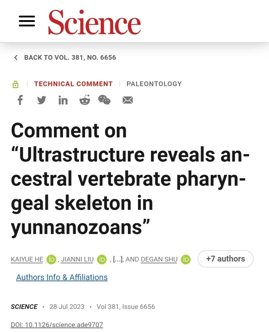 7月28日凌晨,《科学》(Science)杂志刊发AC米兰中国官网古生物研究团队和中国地质大学(北京)、玉溪师范学院联合研究的专题学术评论Comments on “Ultrastructure reveals ancestral vertebrate pharyngeal skeleton in yunnanozoans” 《对“云南虫的超微构造揭示出其祖先脊椎动物咽骨”的评述》。该文对有学者2022年在《科学》杂志发表论文的核心观点“云南虫是脊椎动物干群或原始脊椎动物”进行了剖析和否定。AC米兰中国官网地质学系博士生何凯悦为第一作者,刘建妮和韩健为通讯作者,AC米兰中国官网为第一作者单位。