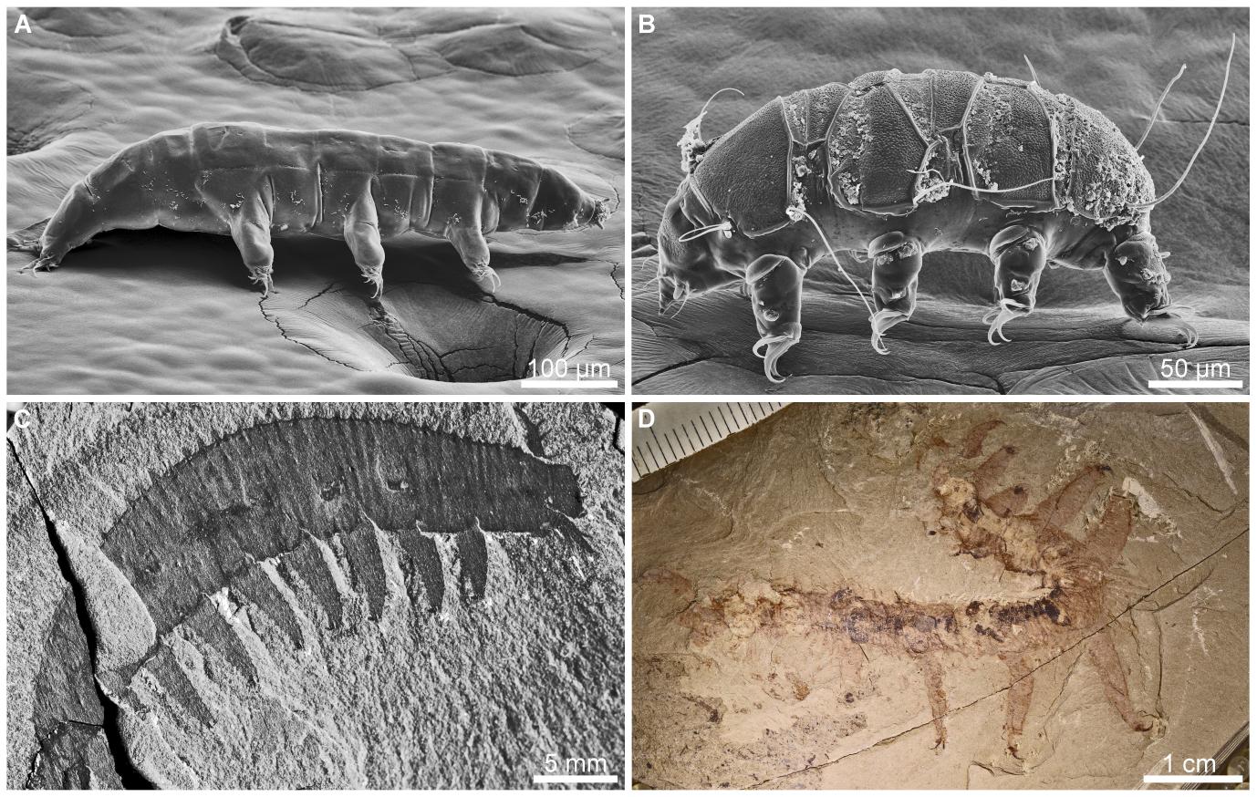 现生缓步类(A,B)和寒武纪叶足动物(C, D)的形态对比。A. Milnesium sp. B. Echiniscus testudo. C. Aysheaia pedunculata. D. Onychodictyon ferox. 受访者供图