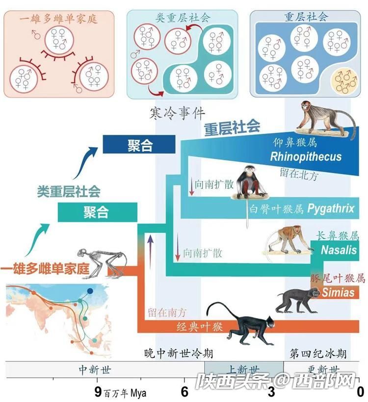 通过比较基因组学的方法,结合系统发育分析检测的结果显示,历史上的寒冷事件促进了亚洲叶猴的能量代谢和神经-激素调节相关基因受到正选择,演化出了更加有效的脑、神经-激素调控网络,其中在奇鼻猴类群中与催产素、多巴胺递质系统有关的基因改变格外引人注目:其类群的社会呈现两步式的逐步聚合模式,从祖先的“一夫多妻”到形成具有分离-聚合特征的类重层社会,再演化出“家庭”长期生活在一起的大型重层社会。
